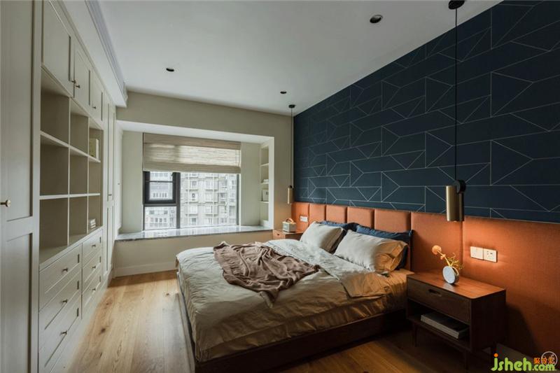 夫妻倆的臥室用了經(jīng)典的藍(lán)橙配色,偏深偏冷的藍(lán)平和了跳脫扎眼的橙,一半是海水,一半是火焰。