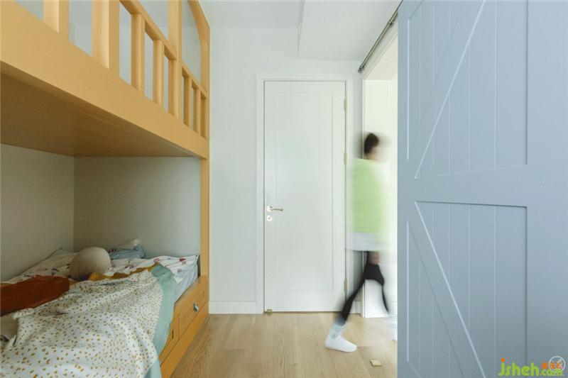 兒童房打通了兩個(gè)房間,但睡眠區(qū)與玩樂區(qū)又以谷倉門分隔,并且在門的兩面顏色上也做了不同深淺的處理,讓小朋友能安心睡,也敞開了玩兒。