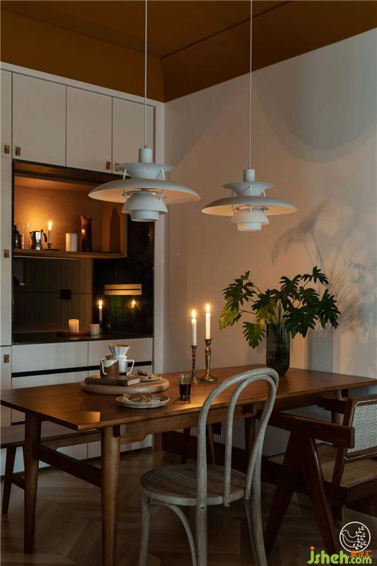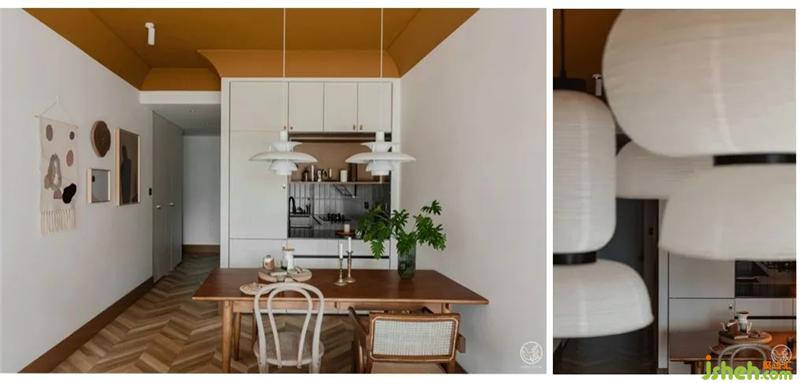 餐廳的物理位置在廚房與客廳中間,我們將廚房與它相接的墻體破開了一個窗口,讓看似融合在客廳里的它,以獨特的方式串起了整個空間。室內(nèi)設計師