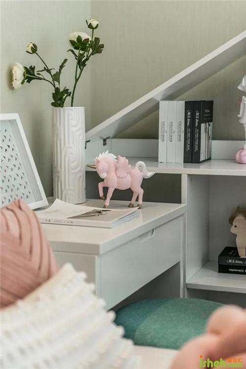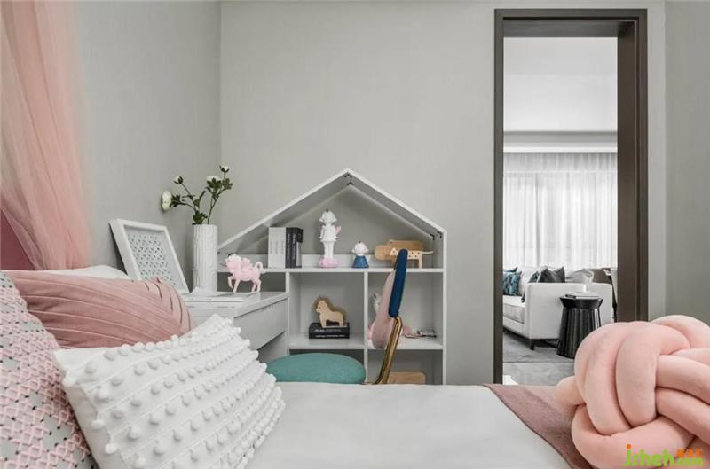 次臥借由甘石粉的優(yōu)雅浪漫表現(xiàn)新生代的生活訴求與價值態(tài)度,彰顯主人的個性。隨意的軟裝布置,增強空間品質(zhì)感與藝術(shù)氣息,藝術(shù)與幾何的碰撞,打造壹個充滿戲劇性的個性、溫暖空間。