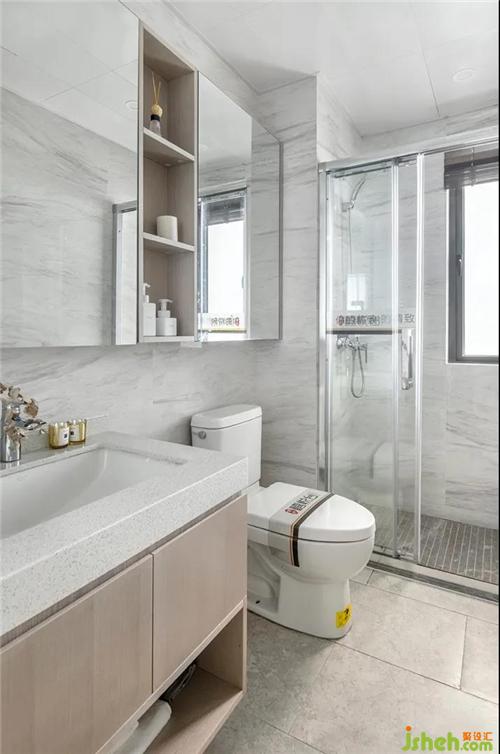 大理石質(zhì)感的衛(wèi)生間很幹凈通透,大理石瓷磚墻壁與暖調(diào)儲物櫃相得益彰,樣板房設(shè)計直邊鏡子展現(xiàn)了利落的直線感,豐富空間的視覺效果。