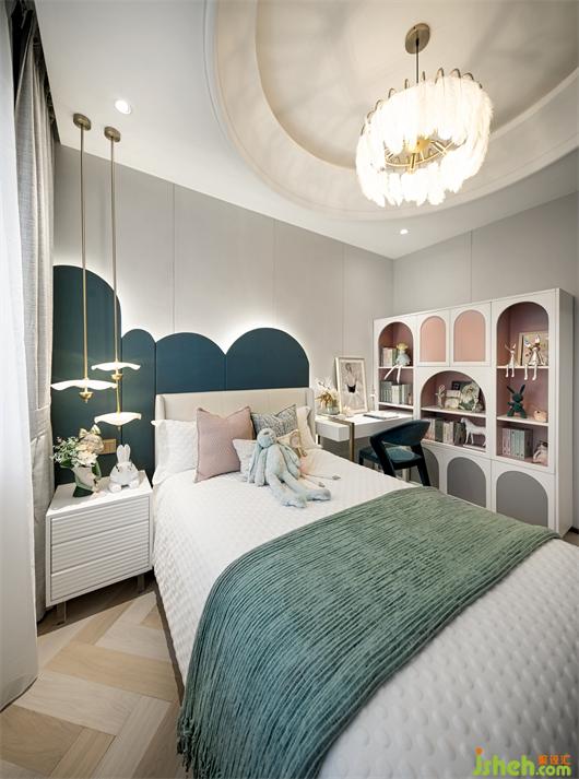 女兒房是清新柔暖的,樣板房設(shè)計師運用皮粉色與綠色的對撞、圓形與線條的幾何語素搭配、抽象掛畫與潮流玩偶的組合,在視覺上予人嶄新而又充滿活力的觀感,描摹出鮮活的空間性格,別致的裝飾元素,又讓此空間的趣味感和甜美感進一步凸顯。