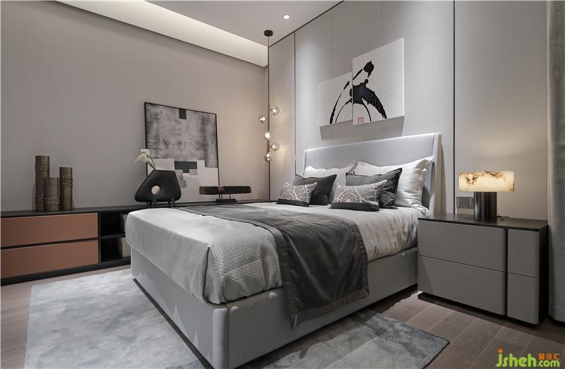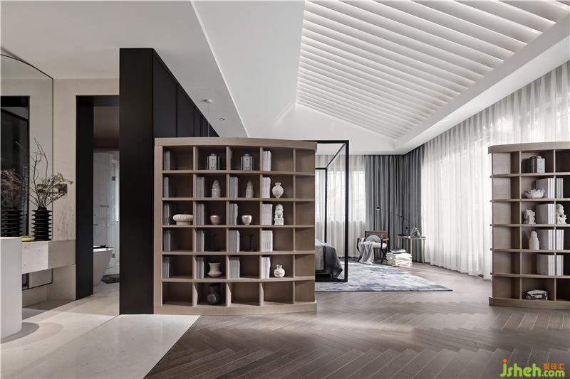 二層作為休憩空間,樣板房設(shè)計(jì)融合書房、衣帽間及浴室作為整體配套設(shè)施,以“梭”為形式設(shè)計(jì)的柜體天花,喚起童年時(shí)代的記憶,天花模擬自然天光,去除裝飾光源,營(yíng)造自然舒適的睡眠環(huán)境,休息區(qū)面朝戶外景觀,將自然攬入懷中。一把舒適的皮質(zhì)單椅,一盞意式極簡(jiǎn)臺(tái)燈,周末午后,拉開窗可見窗外怡人的雅典園林景色;或是疲憊一天后,關(guān)上窗簾,開一盞燈,翻閱幾頁林語堂先生的《生活的藝術(shù)》,陶情遣興。
