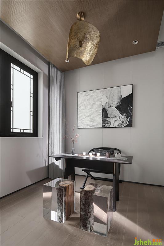 飲茶在嶺南文化中占有重要的一席之地,茶室意境與書房不同,更具傳統(tǒng)意韻。樣板房設(shè)計(jì)黃銅鑄造的吊燈如荷葉自然寫意,主人椅點(diǎn)亮主旨,客凳則由鉑晶樹脂與原木融合,東西交融意味十足。