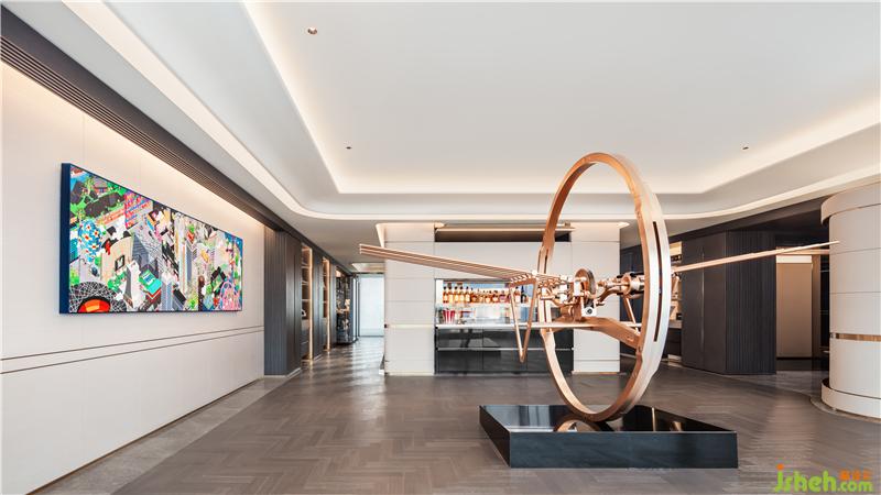 位于空間中央的裝置《羽YU-永動儀》,以具有未來感的金屬造型,為空間注入一種飛翔遨游的動能。在室外高空城景的印襯下,這件裝置,瞬間將居者的心理帶離高樓林立的城市往往給人的逼仄感,而進(jìn)入一種開闊、自由的「玩家」心境。一側(cè)的長幅畫作,以具有漫畫感的當(dāng)代視覺,將北京城的標(biāo)志性景致于二維的墻面中鋪陳開來,猶如窗外真實城景的鏡像。