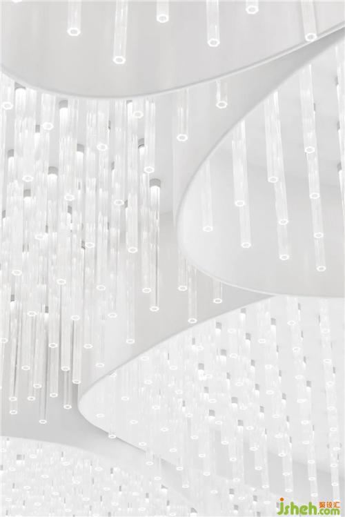 天花開出一朵懸于頭頂、尺度恢弘的「花」,以強大的張力誘惑人抬頭仰望,遙想生活中的美好。設(shè)計對「花」的引用并非具象,而是希望藉由形態(tài)的相關(guān)誘發(fā)心境的回響。佇立其下仿若置身花中,夢幻與現(xiàn)實相混、人與萬物一體。北京會所設(shè)計描摹「花形」的無數(shù)水晶玻璃棒正是連接記憶的無數(shù)纖維,點亮整個會所空間的想象。
