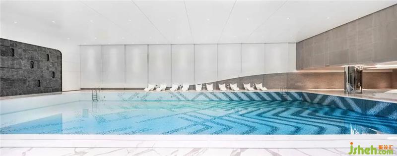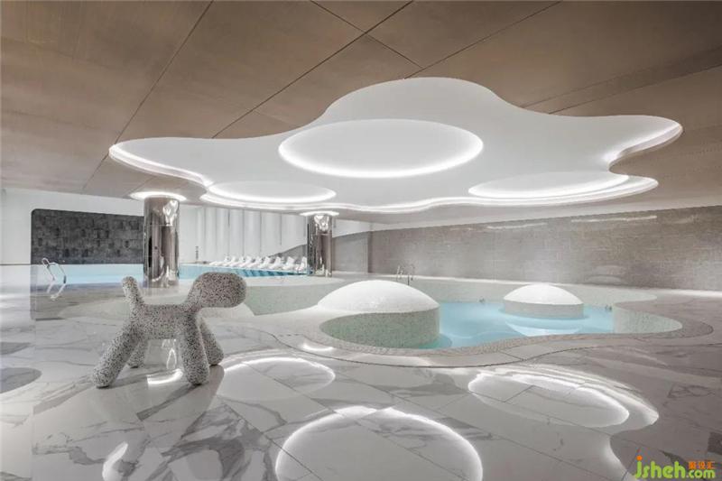 泳池空間,建筑原始結(jié)構(gòu)有兩排柱列,頗具古典空間的儀式感,卻與整體的基調(diào)有所差異。我們希望采用更為抽象、當(dāng)下的設(shè)計(jì)語言去重塑空間氛圍,留出「想象空間」的一隅之地,讓人能夠脫離現(xiàn)實(shí)的桎梏,浮游于萬物原初的混沌。依托空間的L型結(jié)構(gòu),我們劃分兒童區(qū)與成人區(qū),并用材質(zhì)的變化來弱化柱體結(jié)構(gòu)、豐富空間的層次。