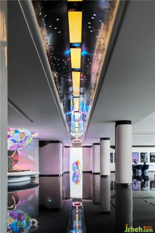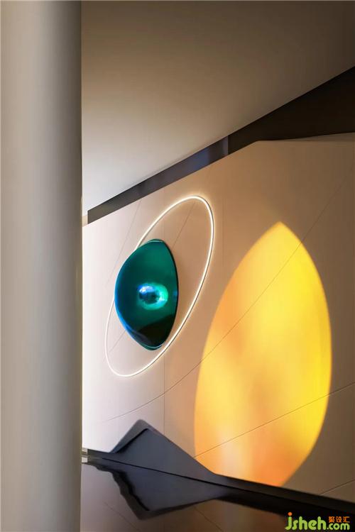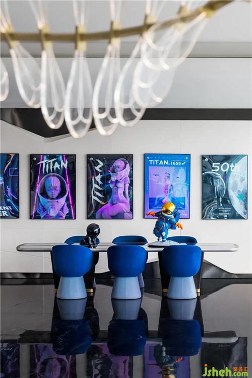 超過半數(shù)的藝術(shù)擺件并未采用「ALTTA來自星球」產(chǎn)品的常規(guī)尺寸,而是依照空間尺度而專門定制,每個IP人物都朝著訪客所在的方向,期待某刻靈魂覺醒,細(xì)細(xì)講述天際見聞??臻g以白色為主色調(diào)——它具有最廣的光譜范圍,東莞售樓處設(shè)計(jì)也是宇航服的常用色。像是陷入冰河時代,萬物驟然凝固,液體依托墻面或柱身在,于將靜未靜之隙,留下曾經(jīng)奔涌的實(shí)證。在此之上,宇宙的蔚藍(lán)無盡、隕石的炫彩斑斕便有了依托,充分彰顯自我的存在。沙盤區(qū)以人造石為底、「隕石」(即《奔星》)為頂。作品《奔星》緣起于藝術(shù)家華成2020特定時代背景下的悲觀沉思「是否地球已然不適合生活?」,在此命題下,衍生出對浩瀚星宇的向往、對親密關(guān)系的渴求及對未來生命的探討,又以奇幻的、絢爛的、神秘的視覺表達(dá),為空間注入充滿希望的、天馬行空的想象?!侗夹恰凡⒎庆o止不動,而是以光線的明滅起伏,與人的呼吸共頻,它借助技術(shù),成為某種獨(dú)特的「生命體」。