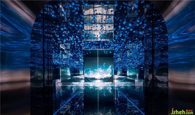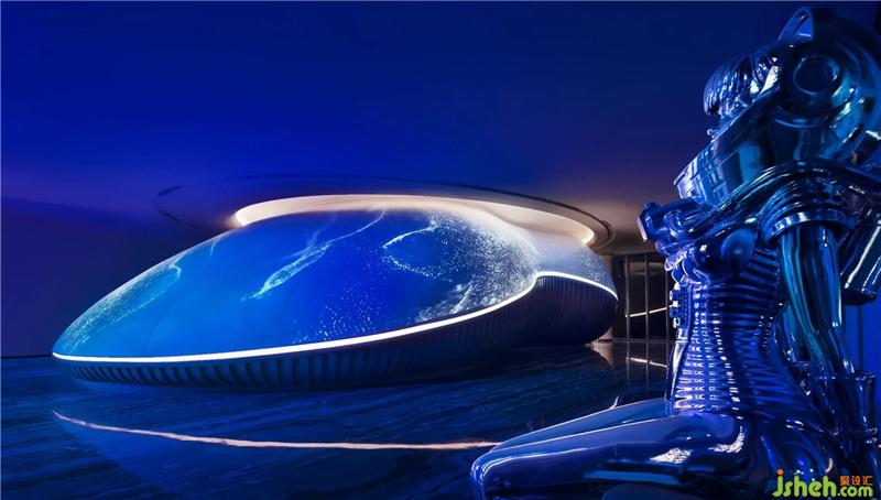 大約在30年前,Kevin Kelly(《連線》雜志主編)曾在《失控》一書中預(yù)判,稱「人造物表現(xiàn)得越來越像生命體;生命變得越來越工程化」。對(duì)待技術(shù)迅猛迭代,藝文界有人抱有一種「懷舊式」反感,又有人如KK般,將機(jī)器視作「我們的孩子」,一種獨(dú)立的生命存在形式。在東莞——一個(gè)以技術(shù)驅(qū)動(dòng)的城市,技術(shù)自然而然地成為了設(shè)計(jì)與藝術(shù)的材料?!柑祀H」,則成為一座技與藝共塑的向上、向新的美學(xué)價(jià)值與精神價(jià)值的容器。門廳處,藝術(shù)家鄭路的藝術(shù)品《0000FF》成為整個(gè)空間「開宗明義」之句。它屬于藝術(shù)家《差翅亞目之目》(即,蜻蜓之眼)作品系列,是一只復(fù)眼,由6200個(gè)個(gè)體組成,猶如生命體,在閃爍、呼吸,是生物和機(jī)器的聯(lián)姻,是無機(jī)物和有機(jī)物相互嵌套的結(jié)果。它的「同宗」屬于沙漠、大?;虺鞘锌臻g,因進(jìn)入室內(nèi),受限于對(duì)話和視看的方式而開啟一場(chǎng)「藝術(shù)進(jìn)化」東莞售樓處設(shè)計(jì)。