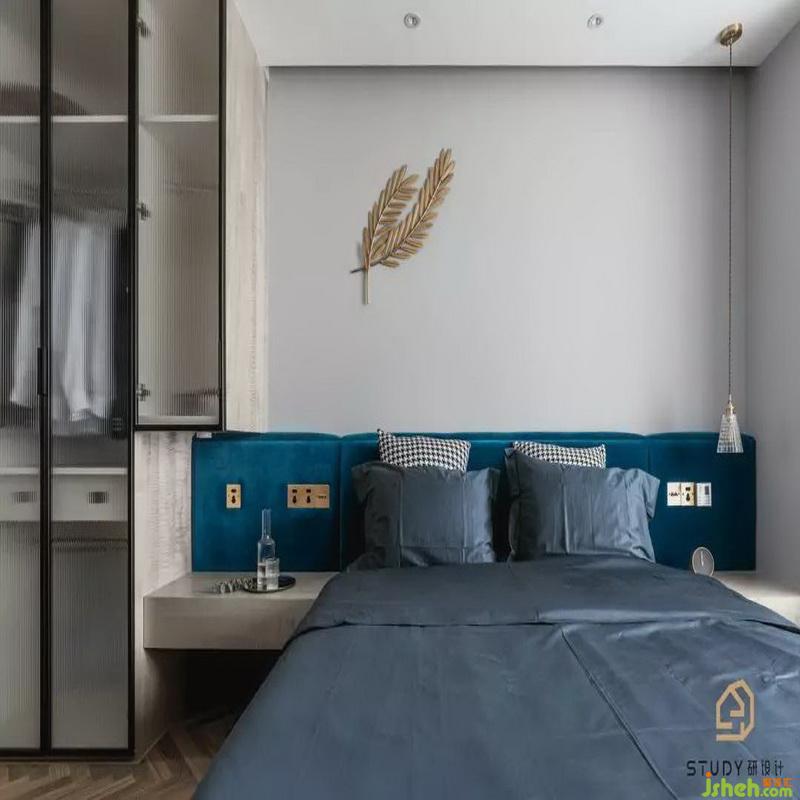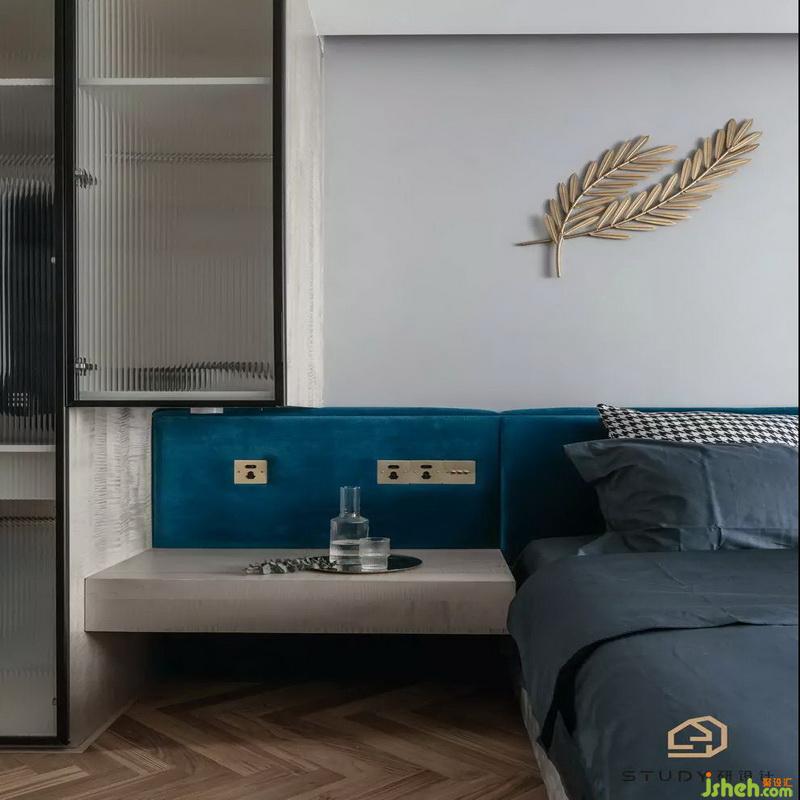 拉上朦朧紗簾,閉上勞累的眼睛,主臥書桌旁的綠色植物,室內(nèi)設(shè)計師搭配上藍色的床單和藍色的靠椅枕,給人舒適以及熟睡的感覺。