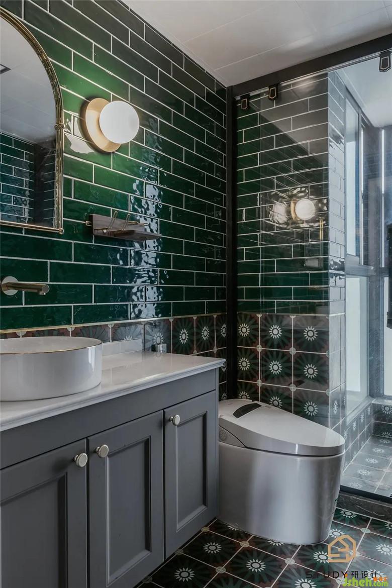 衛(wèi)生間沿襲了外部的氛圍,復古質(zhì)感低調(diào)流露,拱形銅鏡精致的線條,金色光澤克制而優(yōu)雅,鏡前燈柔和的光影間,收獲你笑起來的模樣。