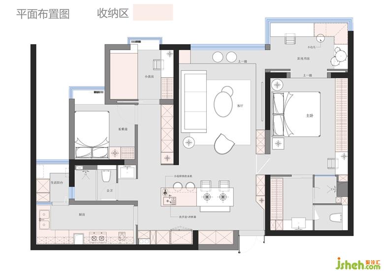 3. 全屋收納沿墻設(shè)置,客餐廳以低矮的收納為主保證空間的通透和開放。