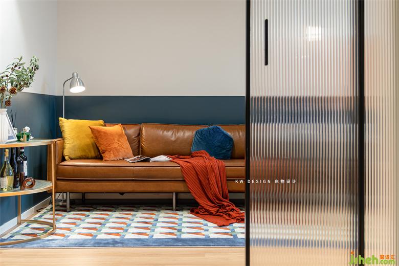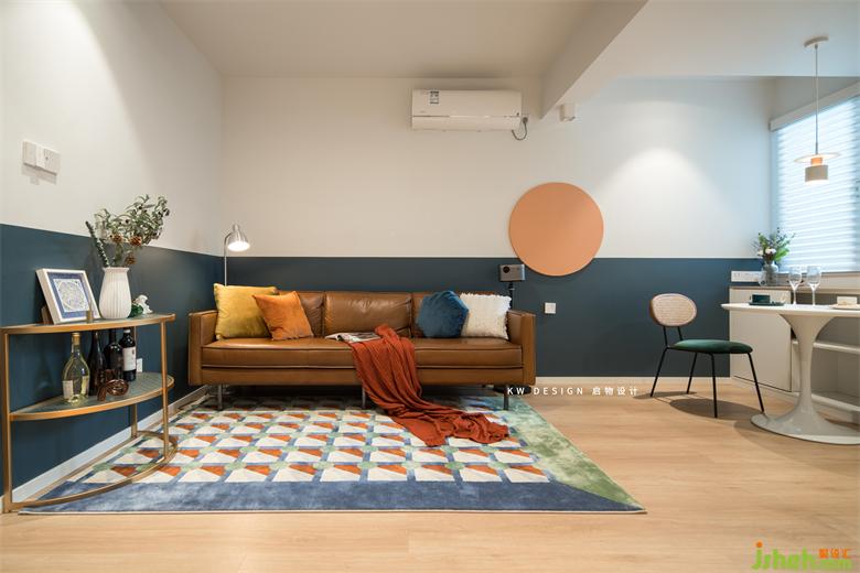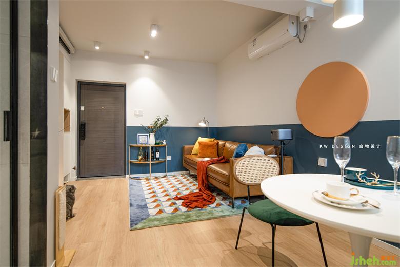 北歐表情的棕色沙發(fā)搭配落地銀色銅燈,精致唯美。家裝設(shè)計拼色幾何地毯幾乎搭上了客餐廳空間的所有色系,仿佛一個集大成者。墻面蔚藍(lán)色半墻浮上圓形橙色色塊,不禁讓人聯(lián)想到蔚藍(lán)的海面,燃燒似火,懸浮其上的落日,浪漫愜意。創(chuàng)意給空間加分。