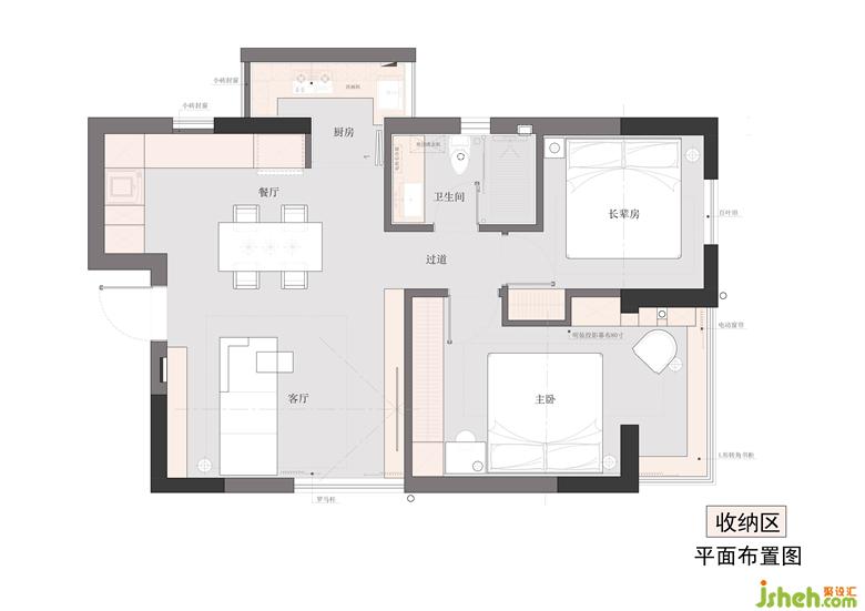 3. 公領(lǐng)域收納由進(jìn)門(mén)向兩側(cè)沿墻設(shè)置,以1.8m大餐桌為中心的回游動(dòng)線弱化空間邊界,無(wú)形放大公領(lǐng)域空間尺度呈現(xiàn)開(kāi)放舒適感。