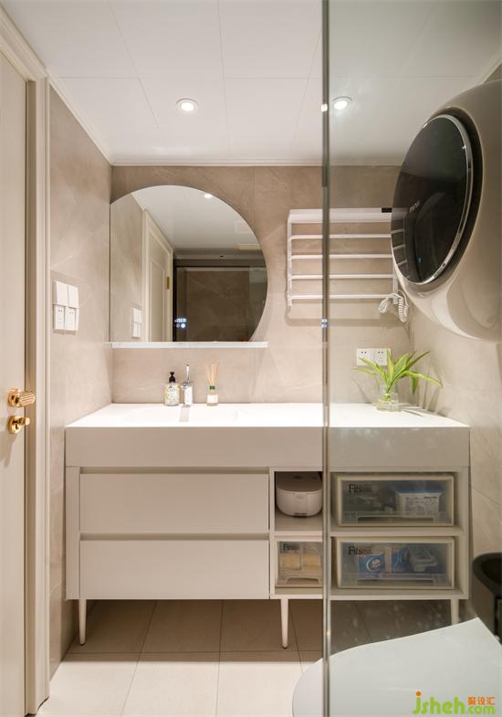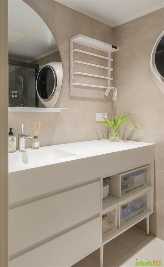 向次臥拓展了90公分開間剛好做淋浴區(qū)。浴室柜也得以延長至1.4m多,景新花園家裝設(shè)計大臺面和下方的強(qiáng)收納裝點女孩子的精致洗護(hù)日常。