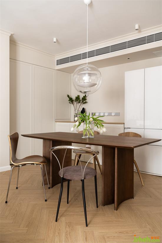 公領(lǐng)域唯一的主動是餐廳的星球吊燈,透明輕盈的球星框架搭配內(nèi)部金屬片,宛如無重力的空間漂浮,景新花園家裝設(shè)計搭配中古餐桌和不同形態(tài)的餐椅,一深一淺,一實一虛,一方一圓,簡單也豐富,多樣也統(tǒng)一。