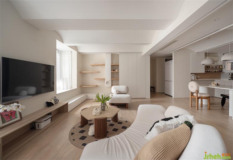 客廳的功能家具面向窗戶布置,圓潤的形體圍合無邊界的休閑活動(dòng)區(qū)??紤]窗臺比較高增加一圈地臺可收納可坐,高中低不同高度的收納設(shè)計(jì)貼合使用者不同的的拿取和整理習(xí)慣,爛泥們爬上窗臺看風(fēng)景也方便多了。