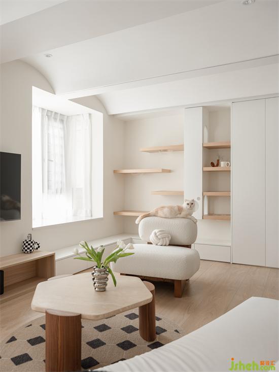 5. 重新規(guī)劃的大開間客廳取消傳統(tǒng)的布置,沿墻分別設(shè)置收納和貓咪活動(dòng)區(qū),中間向自然光源布置功能家具,呈現(xiàn)圍合開放靈動(dòng)的休閑生活領(lǐng)域。