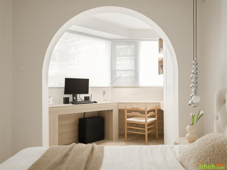 金桂大廈家裝設(shè)計延續(xù)拱形的儀式感,弧形埡口過渡弱化了陽臺的異形斜角,連接工作繪畫區(qū)和睡眠區(qū)。書桌下方收納畫板顏料等工具。