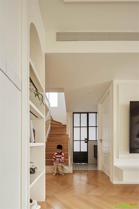 原先由餐廳到客廳的轉彎處是兩個拐角相沖,過道擁擠,把長輩房進門位置內進后擴大了轉角空間,佳兆業(yè)悅峰復式裝修設計一側做弧形開放層板,另一側做懸挑柜補充客廳收納,弱化生硬轉角,舒適順暢的生活動線也得以釋放。