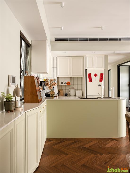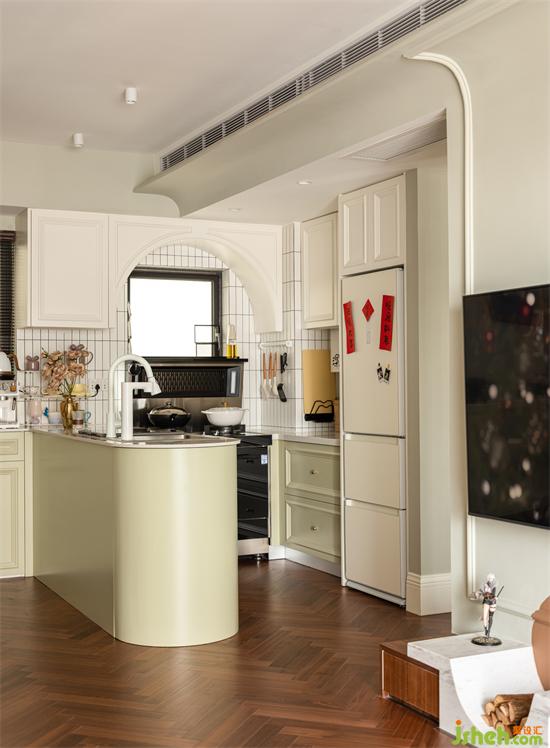 由功能的實(shí)現(xiàn)定義空間形式,代替墻體的分隔,以廚房的操作島臺(tái)連接過渡玄關(guān)-廚房-過道-客餐廳,開放格局放大縱深比例增強(qiáng)視覺的通透感,入戶玄關(guān)的儀式也藉由清新的煙火氣息實(shí)現(xiàn)小家的浪漫歸屬氛圍。