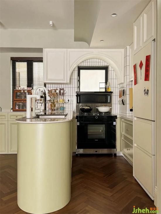 開放式廚房?jī)擅鎵w一面對(duì)著門,一面是窗,考慮風(fēng)水、操作習(xí)慣和空間利用率,棲游家園家裝設(shè)計(jì)在靠窗這面選用集成灶做烹飪區(qū),上部空間做吊柜增加儲(chǔ)物,拱形造型弱化窗洞。黑色集成灶和整體復(fù)古空間是搭的,窗簾窗框和部分家具也有黑色元素。