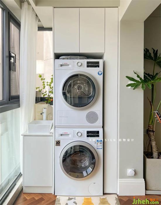 陽臺封窗拓寬休閑區(qū)域,棲游家園家裝設計利用結構凹位做洗衣伴侶。