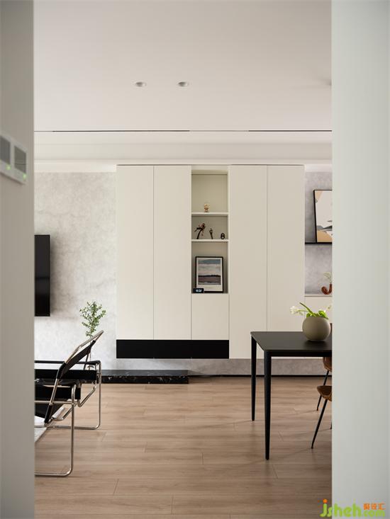 山居歲月家裝設(shè)計(jì)考慮開(kāi)間尺度,保留舒適的視聽(tīng)距離和感受,電視背景沒(méi)有延續(xù)滿墻收納,涂刷水泥藝術(shù)涂料增加背景層次感。10公分高的黑色大理石地臺(tái)隱藏插座電線,形成3米多的低矮平臺(tái)向下收納,放影音設(shè)備或其他展示物品。