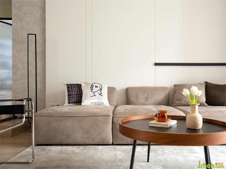 山居歲月家裝設(shè)計(jì)白色線條格柵造型與不規(guī)則藝術(shù)肌理墻面的錯(cuò)落布置簡(jiǎn)約立體沙發(fā)背景,線性燈源和流暢形體的功能家居圍合休閑領(lǐng)域,簡(jiǎn)單幾何形態(tài)貫穿均衡統(tǒng)一的形式美學(xué)語(yǔ)匯。