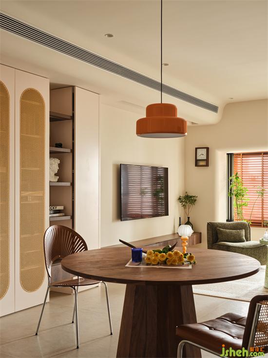 空間上結(jié)合小婉子對風格色彩的偏好,弧形結(jié)構(gòu)搭配奶油色作溫柔耐看的硬裝基底,古著木色與清新調(diào)色色融于其中,瀚海東岸家裝設計平衡現(xiàn)代北歐與復古,打造自然樸實且輕松的中性空間氛圍。