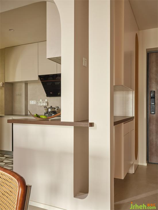 玄關柜與廚房做了結(jié)構(gòu)穿插自然銜接過渡,瀚海東岸家裝設計滿足收納功能卻不見收納體量,同時鏤空的結(jié)構(gòu)為遠離采光面的玄關增添自然光線。