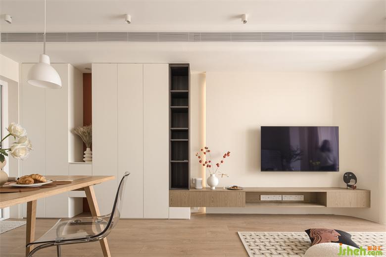 從大門(mén)處沿墻設(shè)置收納,鏤空端景連接玄關(guān)與餐廳的收納補(bǔ)充,黑色開(kāi)放格與木色鑲嵌延伸至電視背景,由柜子本身的結(jié)構(gòu)形式變化形成功能分類(lèi),同時(shí)呈現(xiàn)空間的排序和遞進(jìn)。