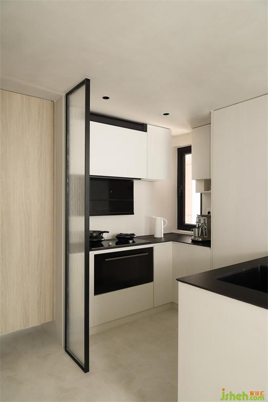開(kāi)放式廚房的設(shè)置釋放了進(jìn)門(mén)的玄關(guān)空間,玻璃隔斷化解大門(mén)對(duì)沖同時(shí)連接過(guò)渡空間。5平方廚房u型布局定制滿額收納,嵌入雙門(mén)冰箱,洗碗機(jī),蒸烤箱,打造高效實(shí)用的餐廚空間。