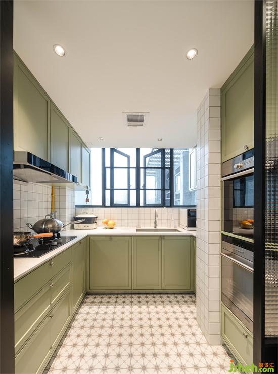 中廚與西廚藉由小花磚和黑色移門區(qū)分過(guò)渡。玻璃移門藏在電器高柜和雙門冰箱之間,家裝設(shè)計(jì)通透材質(zhì)的連接弱化兩個(gè)高大物件的厚重體量。