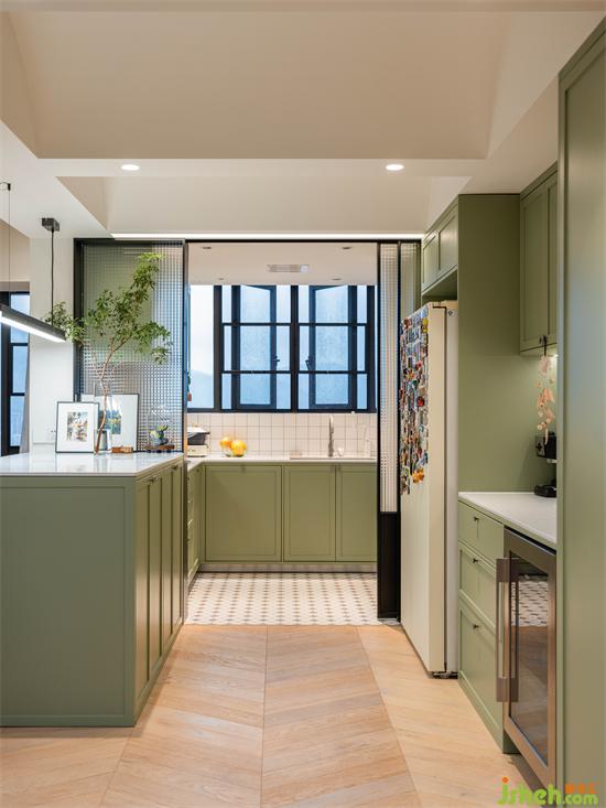 4. 進(jìn)門左邊預(yù)留鞋柜連接西廚的餐邊柜和冰箱,靠?jī)?nèi)的中廚空間預(yù)留推拉門可封閉可開(kāi)放,再由兼吧臺(tái)功能的操作島臺(tái)連接餐廳,實(shí)現(xiàn)利用率和儀式感滿滿的煙火區(qū)。