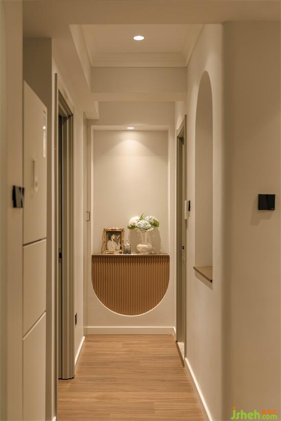 過(guò)道盡頭在倒置的拱門造型里嵌入焦糖色格柵面,擺上琳瑯滿目的物件和花卉,又是一處美的端景。怡楓園家裝設(shè)計(jì)兼具美觀的同時(shí)左邊還內(nèi)嵌了一組收納柜做日常儲(chǔ)物。