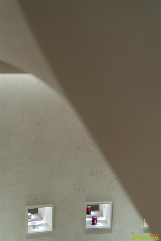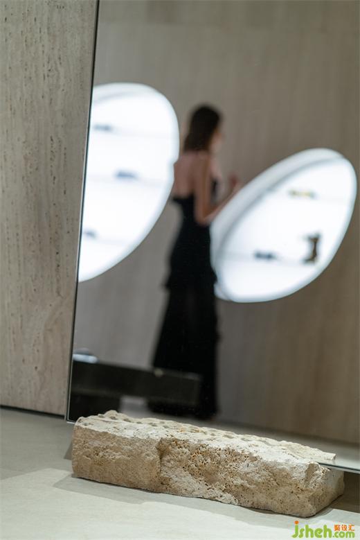 隨旋轉(zhuǎn)階梯順延而下,做舊的藝術(shù)墻體隨之大面積引入眼簾,展廳設(shè)計(jì)在這些仿若已歷經(jīng)百年、蘊(yùn)含時(shí)間與歷史痕跡墻面的環(huán)繞下,使得進(jìn)入者在感官層級(jí)與二層空間實(shí)現(xiàn)了連接與延續(xù)。