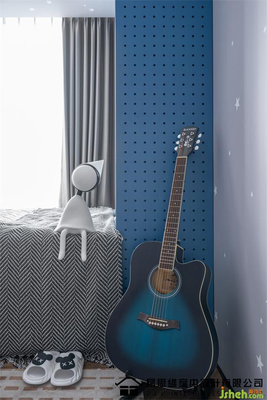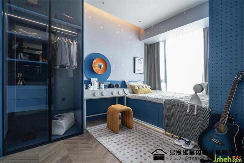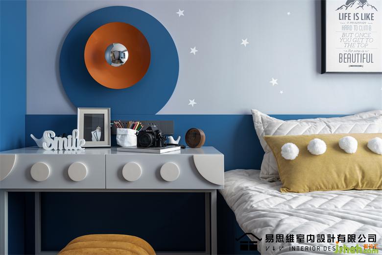 藍色作為空間的主流色,無形中賦予這個空間一種人格的屬性,這應該是屬于愛做夢的少年,充滿童趣的空間催發(fā)著孩子的想象力。佛山家裝設計在大面積的藍色之中,融入淺色的灰藍調進行色彩中和,形成對比且統(tǒng)一的視覺效果。亮眼的橙色仿照太陽的光芒賦予空間無限的創(chuàng)意以及對未來的期許。