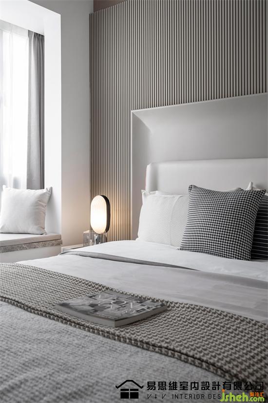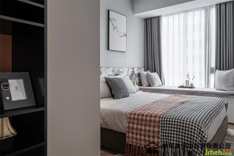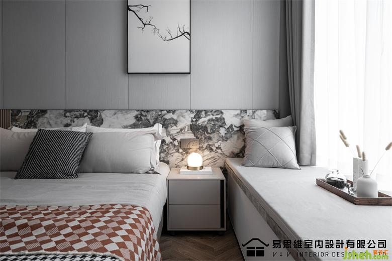 空間利用現下流行的墻面造型將視覺的注意力轉移在具有豐富圖案的石材紋理上,肌理表達出硬朗和干練的視覺,佛山家裝設計配合灰色調的床品、飄窗墊,傳達出穩(wěn)定安靜的情緒。