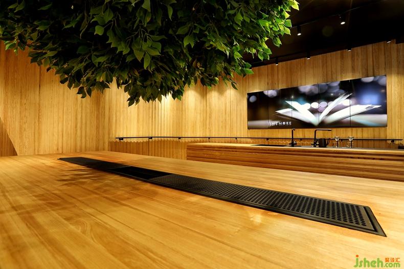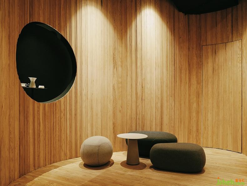 我們把這家店理解成一個(gè)關(guān)于“時(shí)間”的世界。咖啡豆是有生命的,一杯咖啡的制作,研磨、萃取及每一個(gè)步驟都需要耐心和專注。這里也是一個(gè)安靜的世界,時(shí)間在這里靜靜的流淌,這個(gè)世界的組成要素里主要是木頭,時(shí)間凝結(jié)成的生命。一道金屬弧形展架在右側(cè)墻面順勢(shì)劃過(guò),空間始終以二元方式展開(kāi),動(dòng)與靜、剛與柔、內(nèi)與外、正與反。這樣讓整個(gè)空間蘊(yùn)含某種張力。