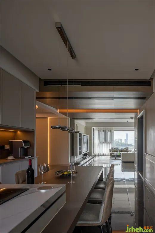 餐廳區(qū)域古樸柔和的木質(zhì)桌板與懸空的金屬吊燈相得益彰,在每個歸家的夜晚,家人圍坐此處品味人間煙火,共度溫馨時光。