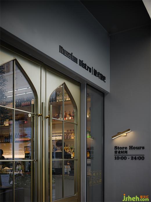 淺灰色半弧縱向條紋作為門頭的主體背景,與入口周圍的淺灰色裝飾墻面相得益彰,構(gòu)成了一種莫蘭迪色的高級感。俄羅斯建筑經(jīng)典“洋蔥頭”造型的金銅色玻璃門彰顯著尊貴和個性,簡單而不失精致的螺旋型壁燈點綴著優(yōu)雅和時尚。