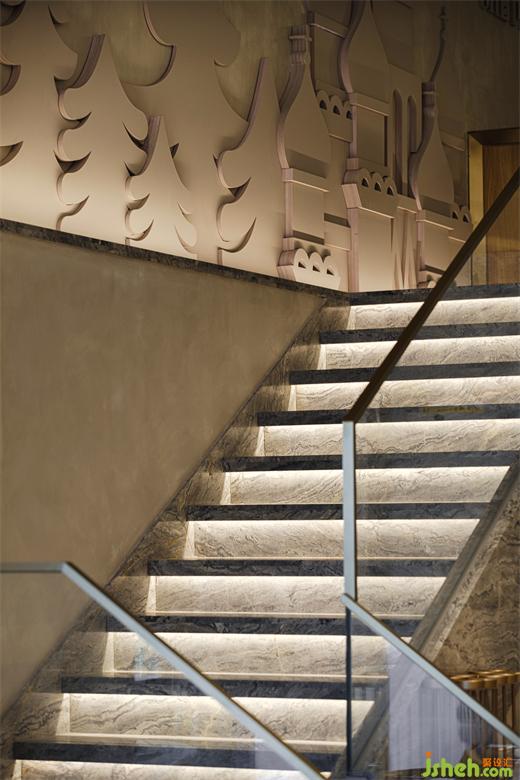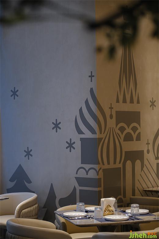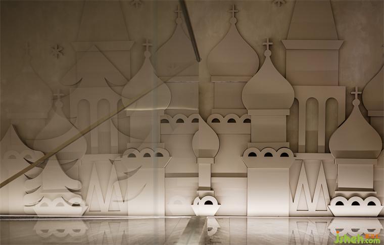 別出心裁的浮雕墻,處于空間每個角度的視野之內(nèi),正在降落的雪花、高低相間的松樹林、深圳俄式餐吧設(shè)計(jì)獨(dú)具一格的“洋蔥頭”教堂,在洗墻燈下生動融合,設(shè)計(jì)師用精煉的語言標(biāo)示了羅格空間獨(dú)特的文化屬性。