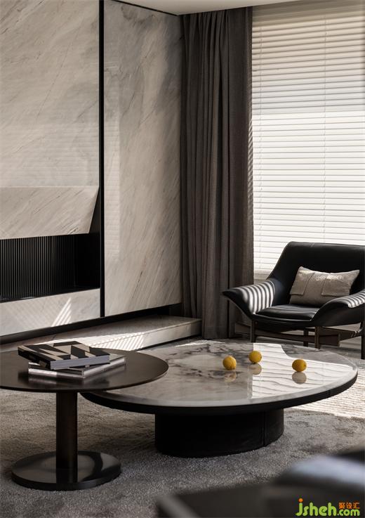 整面石材電視墻、流線型的沙發(fā)座椅以及金屬石材茶幾,樣板間設(shè)計(jì)圍合出舒適通透的交流場(chǎng)域,看似沖突的材質(zhì)在形態(tài)的圍合中微妙相洽,形成空間的層次。