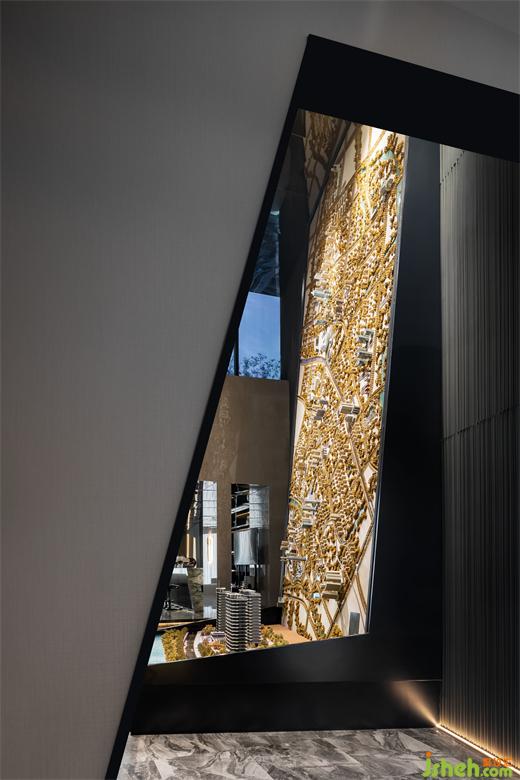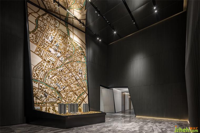 沙盤區(qū)設(shè)計(jì)靈感來自科幻片《盜夢(mèng)空間》,將錯(cuò)落的城市設(shè)計(jì)為一個(gè)多維度空間。不同于傳統(tǒng)沙盤設(shè)計(jì),銳度設(shè)計(jì)利用創(chuàng)新手法將沙盤符號(hào)進(jìn)行解構(gòu)、重組,于墻體之上形成一個(gè)卓然有趣的折疊拉伸,讓可視域范圍得到極大程度的延伸與拓展,營銷中心設(shè)計(jì)構(gòu)建出時(shí)間與空間的無垠宇宙。右側(cè)屏幕墻模擬宇宙中不規(guī)則隕石的降落摩擦面,與沙盤形成某種陌生但是有趣的新能量,予人極具張力的夢(mèng)境懷想。