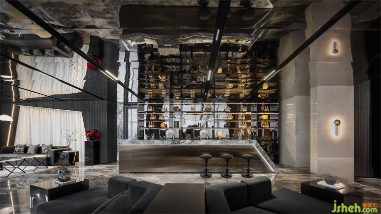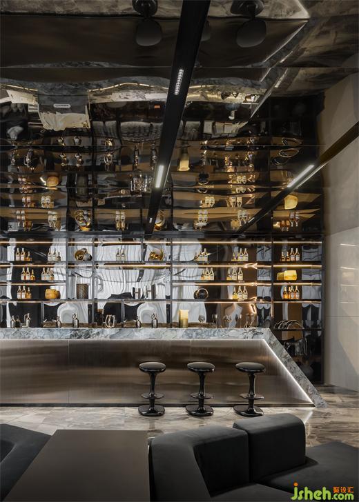 流動(dòng)的是宇宙和時(shí)光,使人在浩渺中漫游未來。水吧區(qū)將開放性與包裹性相結(jié)合,利用空間流線型線條和地面金屬、石材、皮革、透明材質(zhì)相互呼應(yīng)共鳴,360度變幻沉浸式的感官體驗(yàn)。