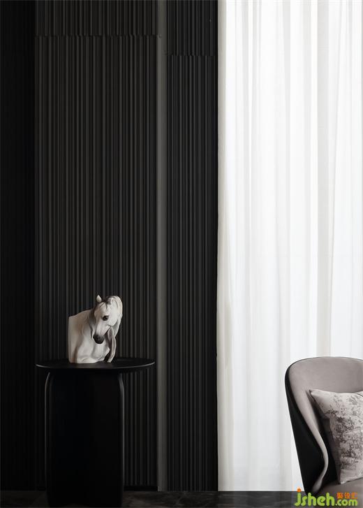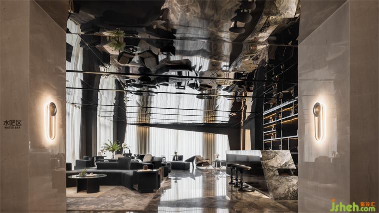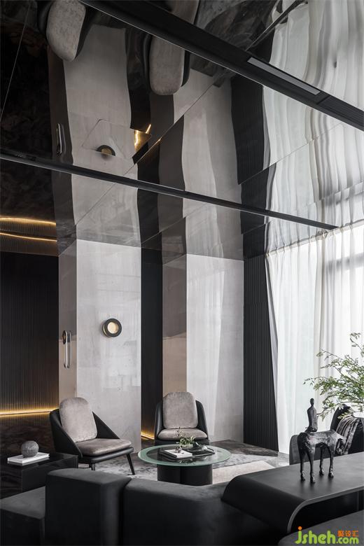 延續(xù)宇宙的神秘,洽談區(qū)空間以大量鏡面材料為背景,頂面采用灰鏡斜面設(shè)計(jì),實(shí)現(xiàn)縱深感。不規(guī)則異形窗框的使用,渲染出充滿生機(jī)的空間力量。在精準(zhǔn)的比例中,用嚴(yán)謹(jǐn)?shù)膸缀沃刃騺順?gòu)建感性的場域,生活的姿態(tài)與宇宙的無盡在這一刻得以共鳴。