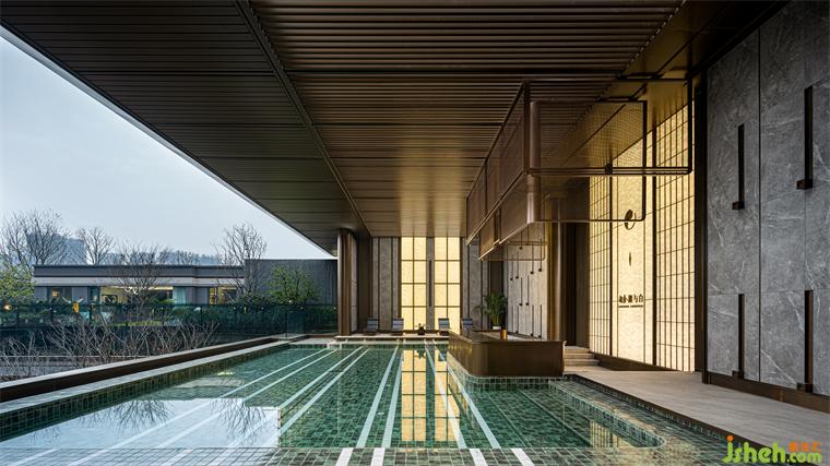 泳池圍繞景觀中庭展開,墻面和地面材料統(tǒng)一使用深色仿石材巖板,墻面星光點(diǎn)綴。營銷中心設(shè)計健身房利用落地玻璃,擴(kuò)大自然流動的空間屬性與自然產(chǎn)生對話,陽光透過玻璃照射進(jìn)來,運(yùn)動的疲憊在這一刻得到撫慰。運(yùn)動空間的設(shè)計,創(chuàng)造出一個自在交流、健康運(yùn)動的社交場域,為居住者構(gòu)筑一處志趣相投的圈層領(lǐng)地。
