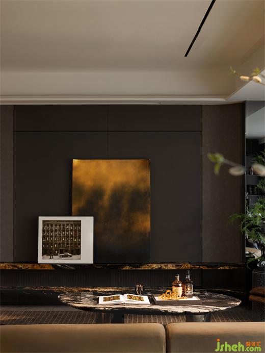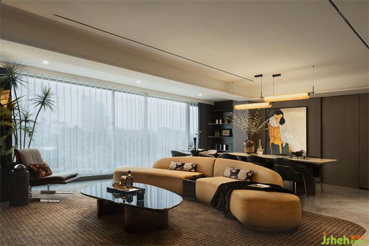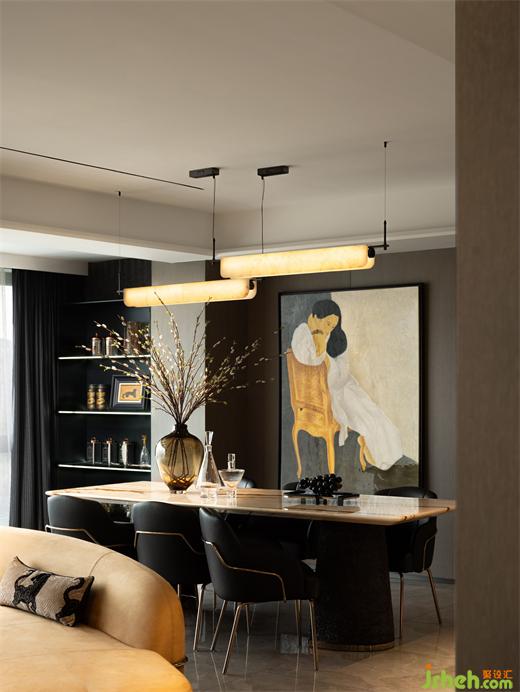 客餐廳選用橫廳一體化設計,避免傳統(tǒng)功能割裂的布局,打造出空間更多的可能性?;⌒握嫫ど嘲l(fā)配以深灰地毯,色彩對撞中形成豐富的材質質感。墻體由富有肌理感的深色皮革鑲貼,與一側輕盈飄逸的紗幔形成了鮮明的虛實對比。變化的光影浮現(xiàn)于結構與材質交錯處,于每一寸空間中,盡享精致生活態(tài)度。