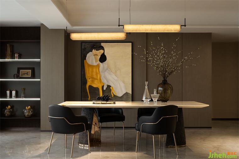 餐廳捕捉出當代都市的生活哲學。長方形大理石餐桌、黑色皮革餐椅與吊線型藝術燈具,通過物境、情景、意境相融合,在一餐一食中,收藏著生活的真諦。